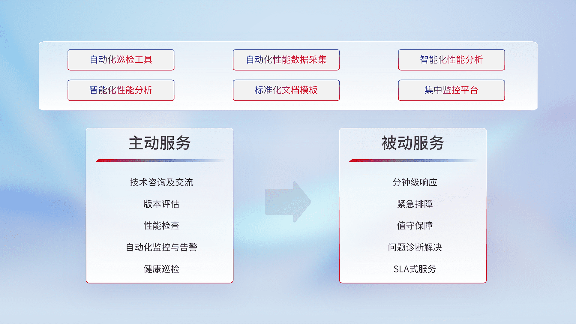 智能化工具和标准化文档,,,,保障服务质量,,,,提供主动服务(包含技术咨询、、、、版本评估、、性能检查、、、自动化监控与告警、、、、健康巡检)和被动服务包含(分钟级响应、、、、紧急排障、、、、值守保障、、、问题诊断解决、、、SLA服务)。。